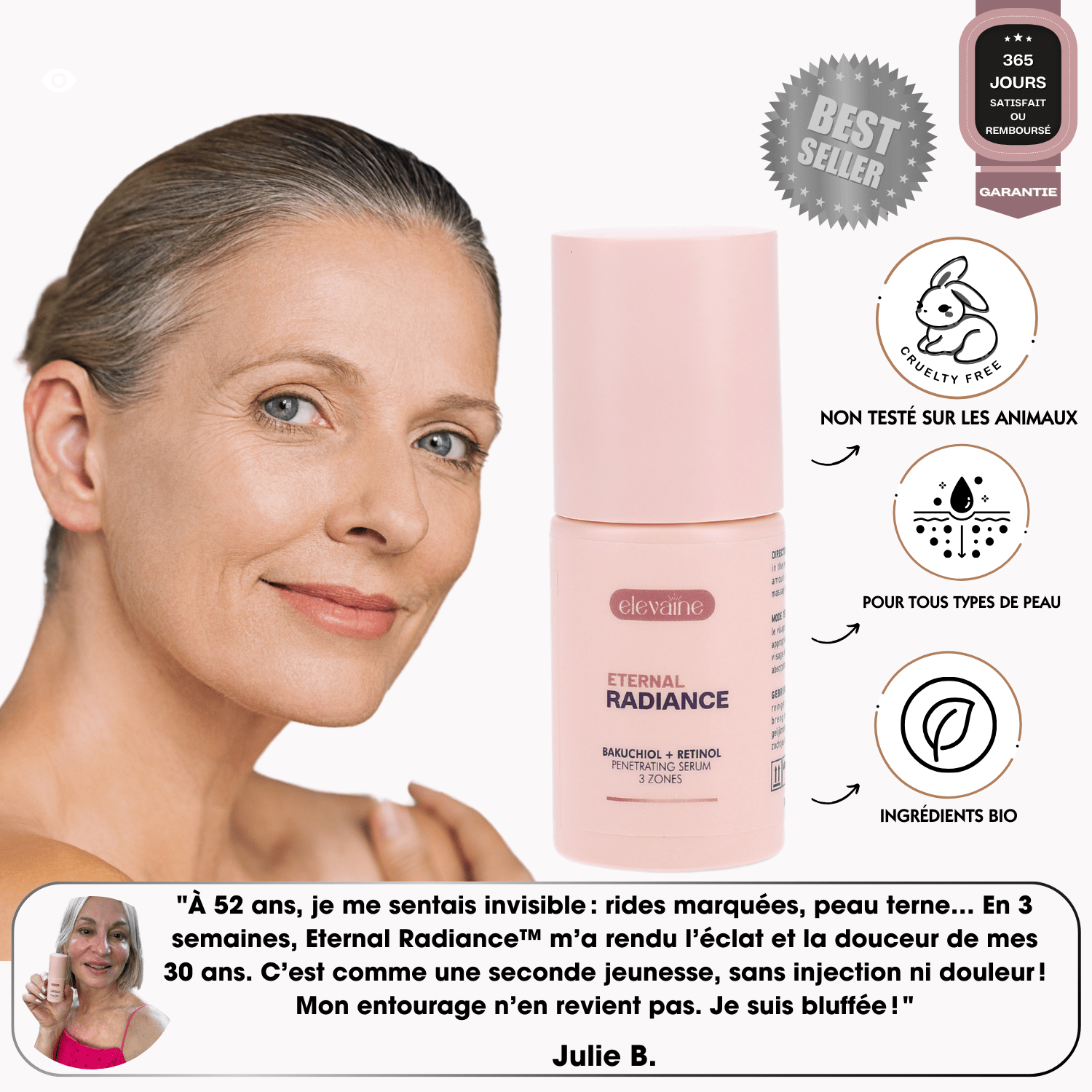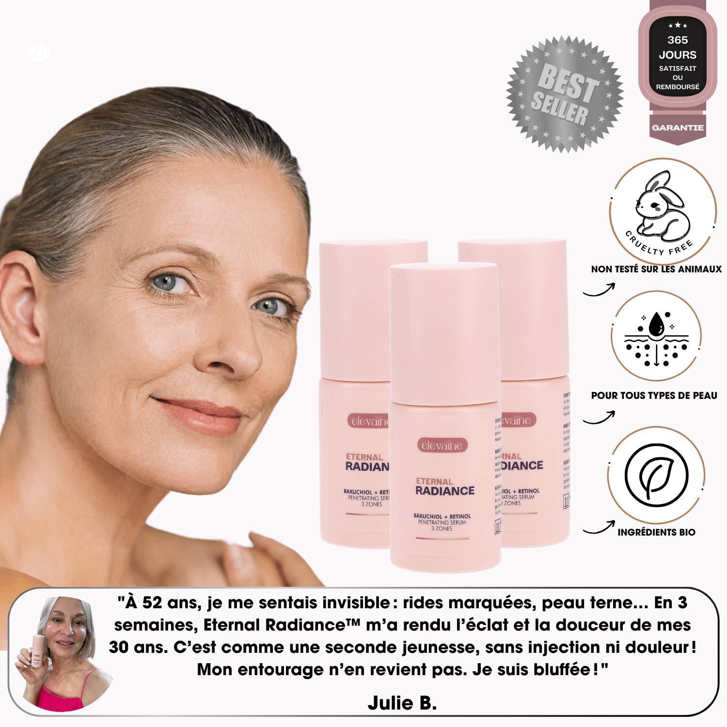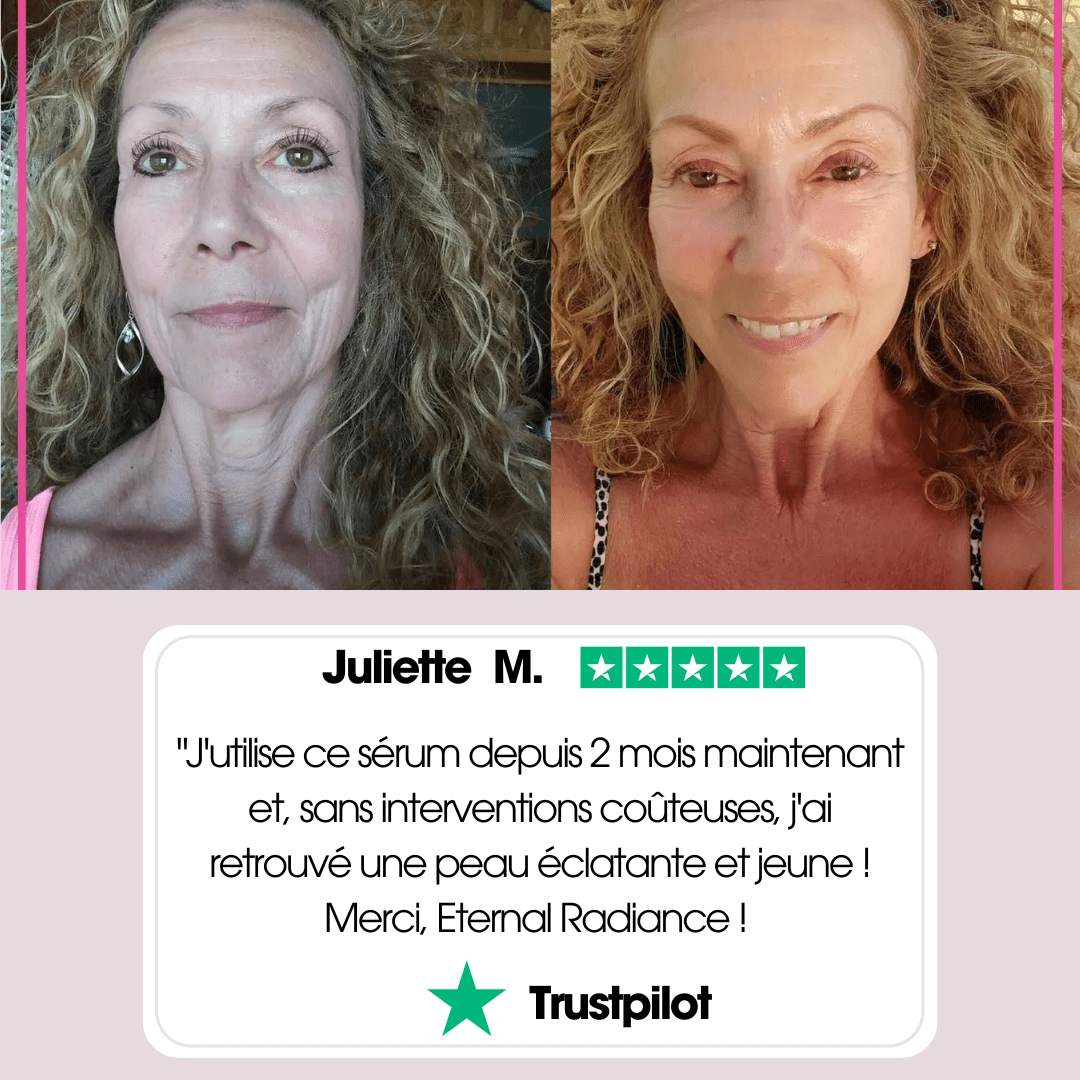 "J'ai toujours cherché un sérum capable de vraiment transformer ma peau. Dès la première application de Eternal Radiance™, ma peau semblait plus lisse et hydratée.